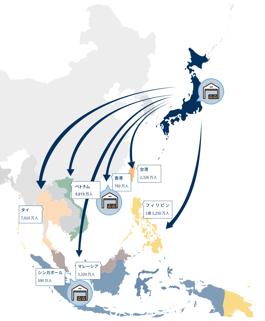 当社香港倉庫から各国への越境ECとなります。配送料/物流面に強みがあります。